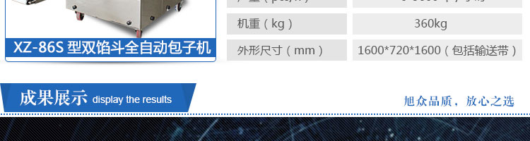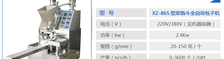 名稱XZ-86S型雙餡斗全自動(dòng)包子機(jī) 電源220/380V(見機(jī)器名牌) 功率2.4kw 產(chǎn)量0-3600個(gè)/小時(shí) 尺寸1600*720*1600mm(包括輸送帶) 重量360kg 規(guī)格20-150克/個(gè) 其他