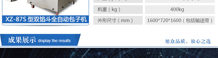 名稱XZ-87S型雙餡斗全自動(dòng)包子機(jī) 電源220/380V(見機(jī)器名牌) 功率2.4kw 產(chǎn)量0-3600個(gè)/小時(shí) 尺寸1600*720*1600mm(包括輸送帶) 重量400kg 規(guī)格20-150克/個(gè) 其他