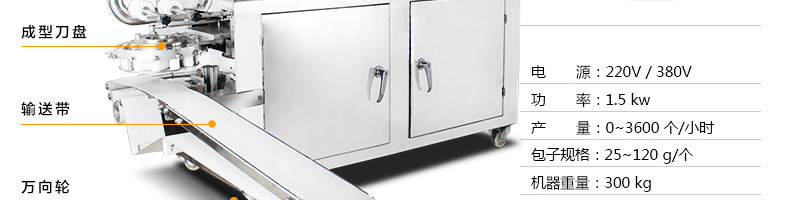 名稱290III卷面式包子機(jī) 電源220/380V(見機(jī)器名牌) 功率2.4kw 產(chǎn)量0-3600個/小時 尺寸2050*1470*1480mm(包括輸送帶) 重量400kg 規(guī)格25-130克/個 其他