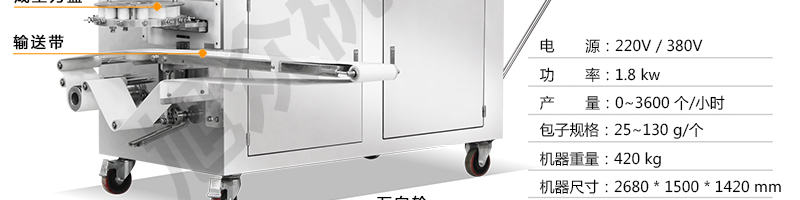 名稱XZ-290IIA包子機(jī) 電源220/380V(見(jiàn)機(jī)器名牌) 功率1.8kw 產(chǎn)量0-3600個(gè)/小時(shí) 尺寸2680*1500*1420mm(包括輸送帶) 重量420KG 規(guī)格25-130克/個(gè) 其他
