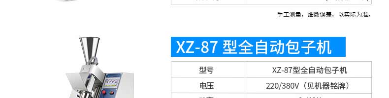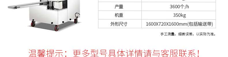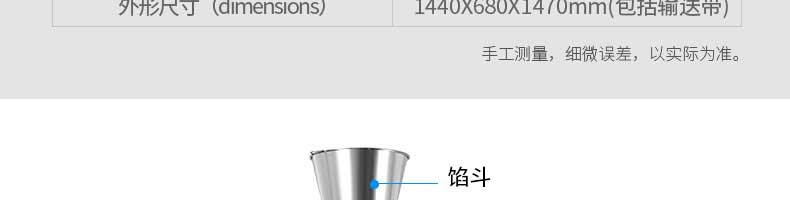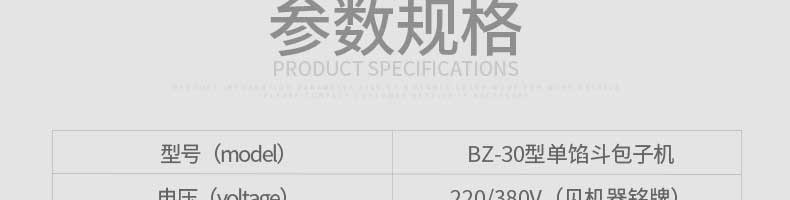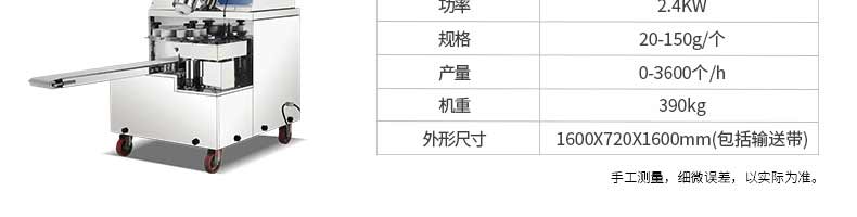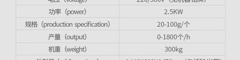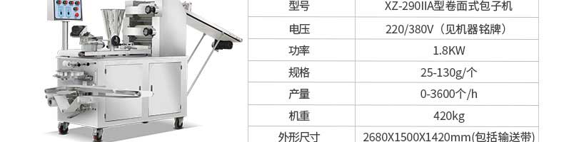 名稱旭眾30單餡斗包子機 電源220/380V(見機器名牌) 功率2.5kw 產量0-1800個/小時 尺寸1440*680*1420mm(包括輸送帶) 重量300KG 規(guī)格20-100克/個 其他
