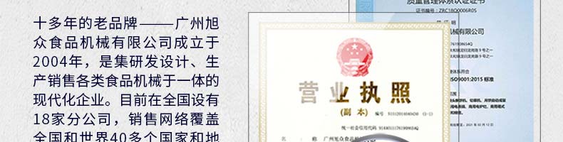 廣州旭眾食品機械有限公司是一家集科研開發(fā),生產(chǎn)設(shè)計,營銷服務(wù)為一體的現(xiàn)代化生產(chǎn)企業(yè)?,F(xiàn)代化生產(chǎn)車間,精湛制造技術(shù),所產(chǎn)機械歷經(jīng)市場重重考驗,不斷贏得海內(nèi)外客戶的贊譽。