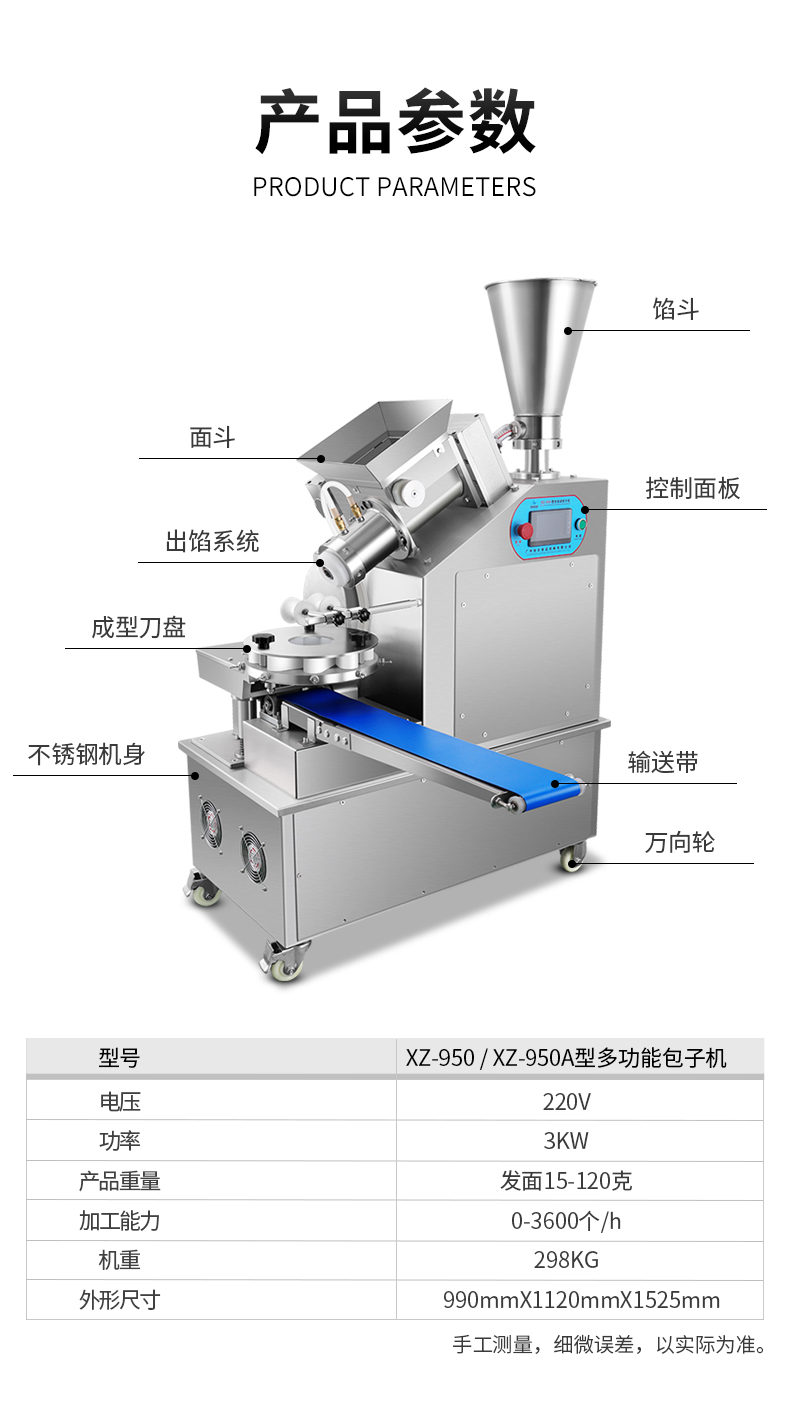 名稱XZ-950型多功能包子機(jī) 電源220V 功率3KW 產(chǎn)量0-3600個(gè)/h 尺寸990mmxl120mmx1525mm 重量298KG 規(guī)格發(fā)面15-120克 其他