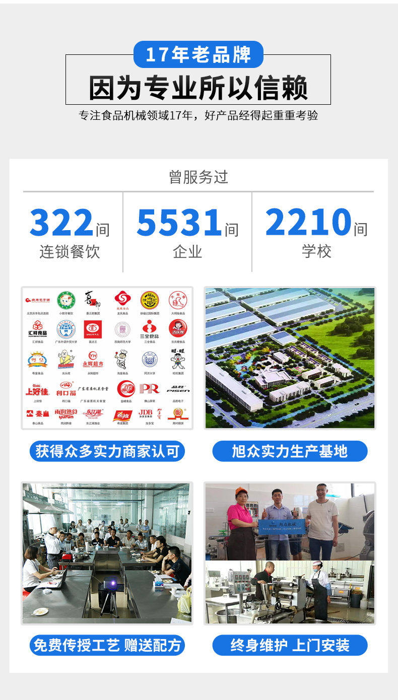 廣州旭眾食品機(jī)械有限公司是一家集科研開發(fā),生產(chǎn)設(shè)計(jì),營銷服務(wù)為一體的現(xiàn)代化生產(chǎn)企業(yè)?,F(xiàn)代化生產(chǎn)車間,精湛制造技術(shù),所產(chǎn)機(jī)械歷經(jīng)市場重重考驗(yàn),不斷贏得海內(nèi)外客戶的贊譽(yù)。