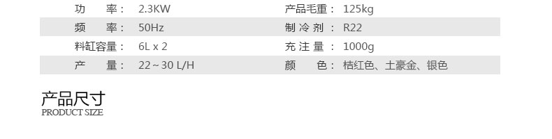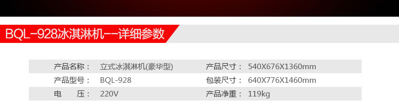 名稱BQL-928立式冰淇淋機 電源220V 功率2.3kw 產(chǎn)量22-30L/H 尺寸540*590*1360mm 重量119kg 規(guī)格 其他