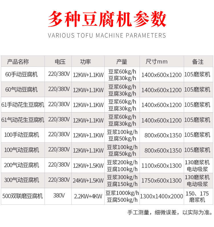 名稱XZ-100型全自動豆腐機 電源220/380V 功率磨漿11KW,煮漿12KW 產(chǎn)量豆?jié){產(chǎn)量100kg/h,豆腐產(chǎn)量50kg/h 尺寸800X600X1350mm 重量150kg 規(guī)格聯(lián)系銷售員 其他