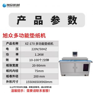名稱XZ-170多功能墊紙機(jī) 電源220V/50Hz 功率1.2kw 產(chǎn)量10-100個/分鐘 尺寸1550*650*960mm 重量聯(lián)系銷售員 規(guī)格紙張寬20-90mm,內(nèi)徑75mm,外徑200mm 其他