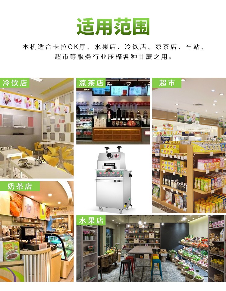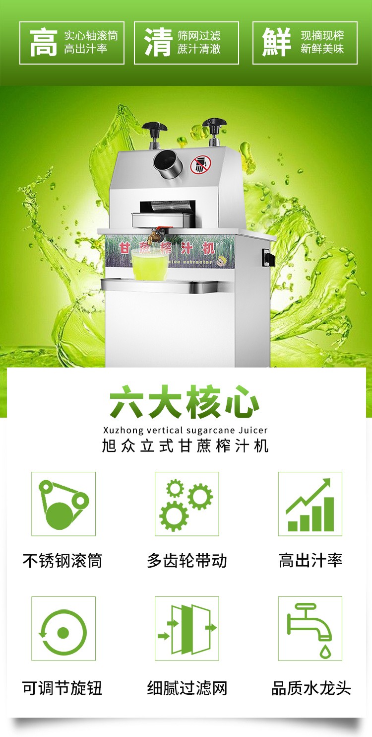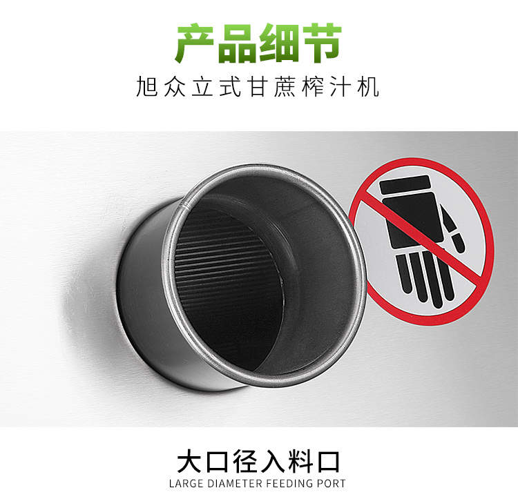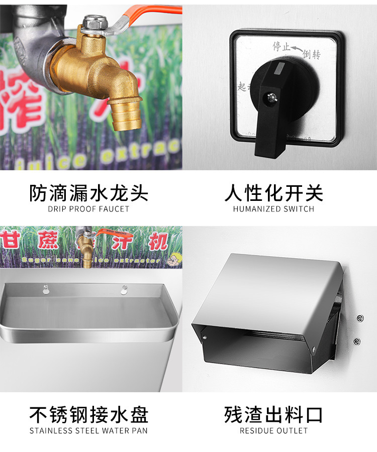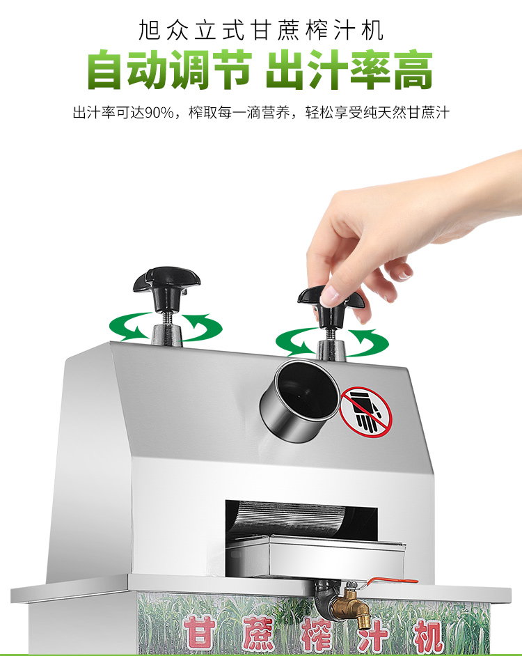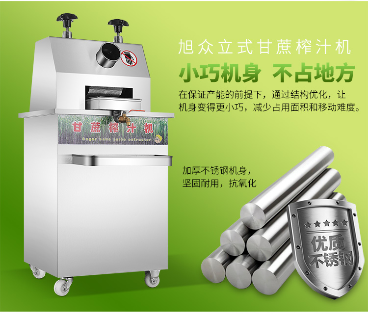 立式甘蔗機,該機采用不銹鋼材質(zhì)加工,機頭部件都經(jīng)過嚴格的防銹仿腐蝕處理,整機采用全封閉結(jié)構(gòu),可內(nèi)置蔗渣桶,保證渣汁不外泄,安全、干凈、衛(wèi)生。 適合賓館、卡拉OK廳、水果店、冷飲店、涼茶店、車站、超市等服務行業(yè)壓榨各種甘蔗之用。