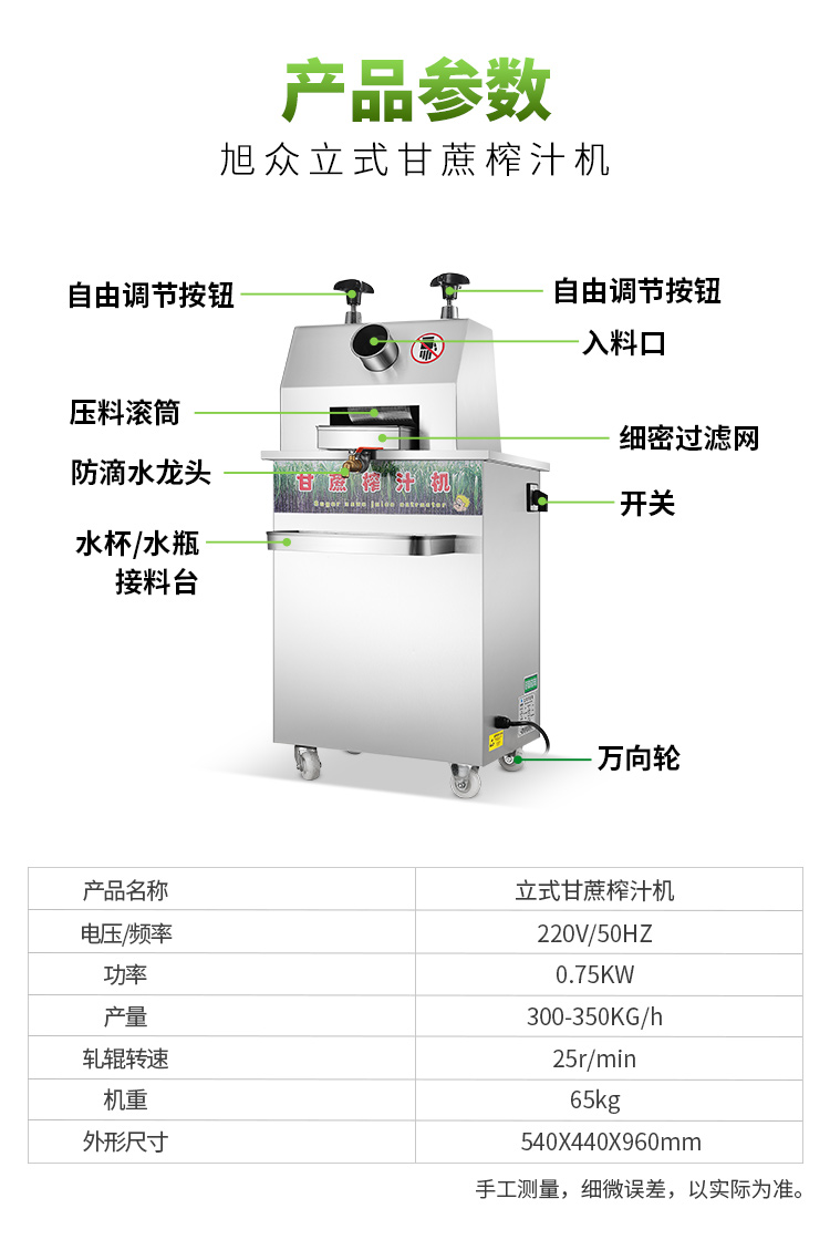 名稱立式甘蔗機 電源220V/50Hz 功率0.75kw 產(chǎn)量300-350kg/h 尺寸外形尺寸540*440*960mm 重量65kg 規(guī)格 其他