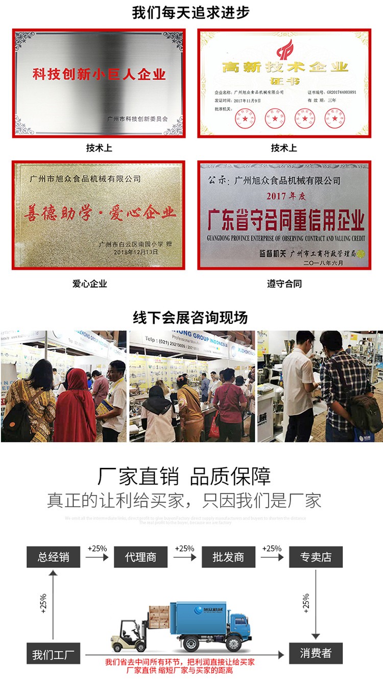 廣州旭眾食品機械有限公司是一家集科研開發(fā),生產(chǎn)設計,營銷服務為一體的現(xiàn)代化生產(chǎn)企業(yè)?,F(xiàn)代化生產(chǎn)車間,精湛制造技術(shù),所產(chǎn)機械歷經(jīng)市場重重考驗,不斷贏得海內(nèi)外客戶的贊譽。