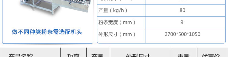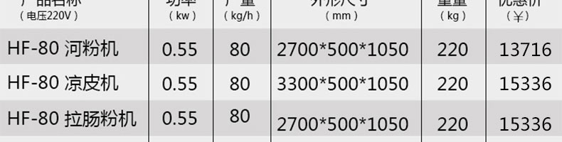 名稱SZ-HF-80高效節(jié)能河粉機(jī) 電源220/380V 功率0.75/22kw 產(chǎn)量24/36/48/60kg/h 尺寸主機(jī)尺寸2700*500*1050mm 外形尺寸2800*700*1500mm 重量220kg 規(guī)格粉條寬度mm:4/6/8/10 其他