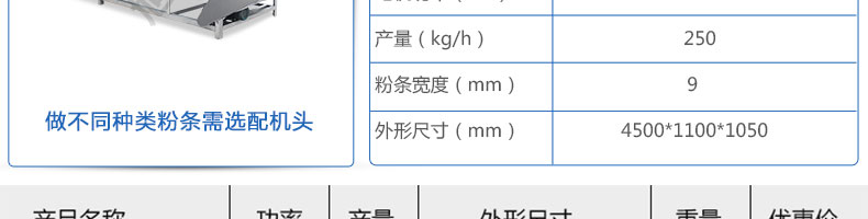 名稱SZ-HF-250涼皮機 電源220/380V 功率1.1/81kw 產(chǎn)量100/150/200/250kg/h 尺寸主機尺寸5500*1000*1050mm 外形尺寸5600*1200*1500mm 重量500kg 規(guī)格粉條寬度mm:4/6/8/10 其他