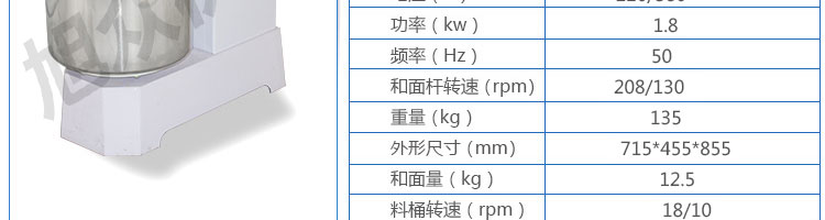 名稱SZH-30型雙速雙動(dòng)和面機(jī) 電源220/380V 功率1.8kw 產(chǎn)量 尺寸外形尺寸715*455*855mm 重量135kg 規(guī)格 其他