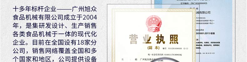 廣州旭眾食品機(jī)械有限公司是一家集科研開(kāi)發(fā),生產(chǎn)設(shè)計(jì),營(yíng)銷服務(wù)為一體的現(xiàn)代化生產(chǎn)企業(yè)?,F(xiàn)代化生產(chǎn)車(chē)間,精湛制造技術(shù),所產(chǎn)機(jī)械歷經(jīng)市場(chǎng)重重考驗(yàn),不斷贏得海內(nèi)外客戶的贊譽(yù)。