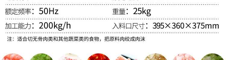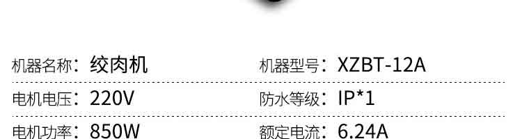 名稱XZBT-12A絞肉機 電源220V 功率850W 產(chǎn)量 尺寸395×360×375mm 重量25kg 規(guī)格 其他