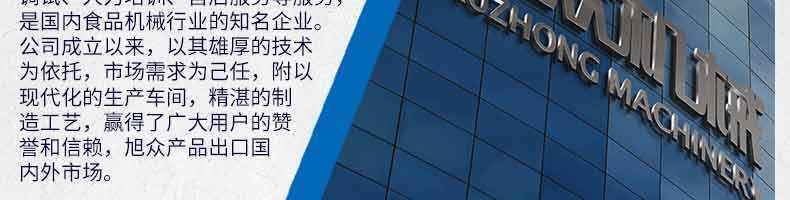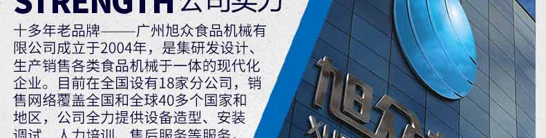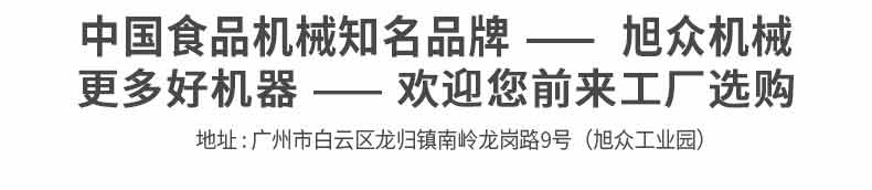 廣州旭眾食品機械有限公司是一家集科研開發(fā),生產(chǎn)設(shè)計,營銷服務(wù)為一體的現(xiàn)代化生產(chǎn)企業(yè)?,F(xiàn)代化生產(chǎn)車間,精湛制造技術(shù),所產(chǎn)機械歷經(jīng)市場重重考驗,不斷贏得海內(nèi)外客戶的贊譽。