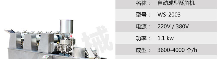 名稱WS-2003 型自動成型酥角機(油餃機) 電源220/380V 功率1.1kw 產(chǎn)量3600-4000個/小時 尺寸外形尺寸3150*500*1300mm 重量450kg 規(guī)格 其他