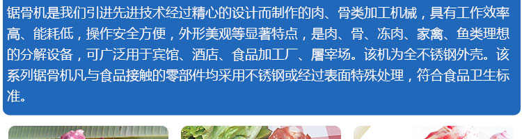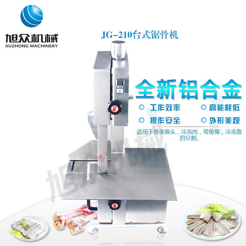 JG-210臺(tái)式鋸骨機(jī),適用于各類骨頭,冷凍肉,帶魚骨,冰塊,冷凍魚的分割。采用全不銹鋼材料制作,具有工作效率高,操作安全的特點(diǎn)。廣泛適用于食品加工廠,屠宰場(chǎng),肉類加工廠等