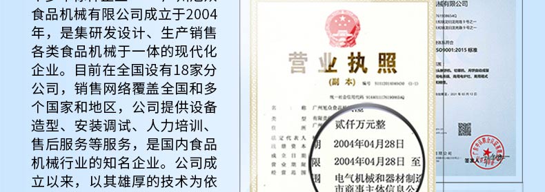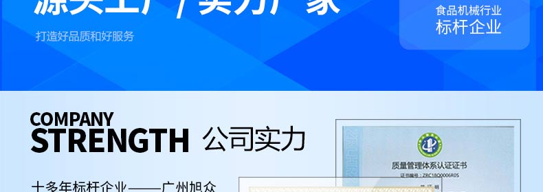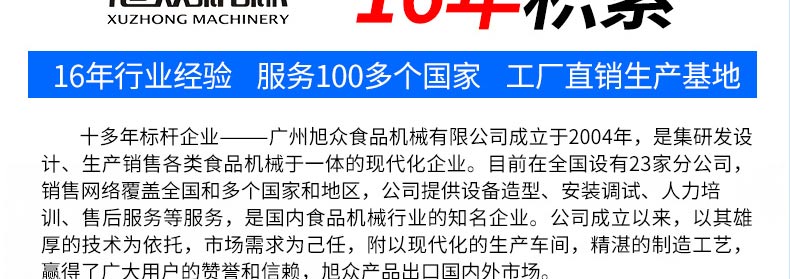 廣州旭眾食品機械有限公司是一家集科研開發(fā),生產(chǎn)設(shè)計,營銷服務(wù)為一體的現(xiàn)代化生產(chǎn)企業(yè)。現(xiàn)代化生產(chǎn)車間,精湛制造技術(shù),所產(chǎn)機械歷經(jīng)市場重重考驗,不斷贏得海內(nèi)外客戶的贊譽。
