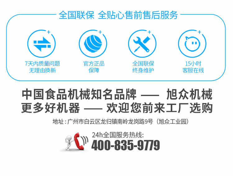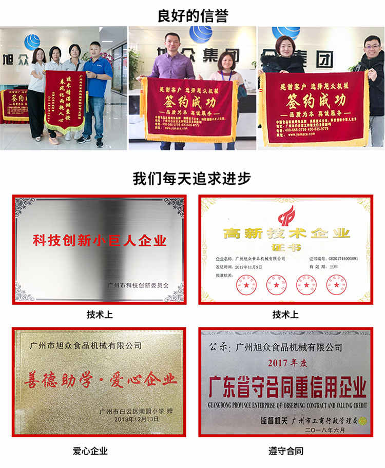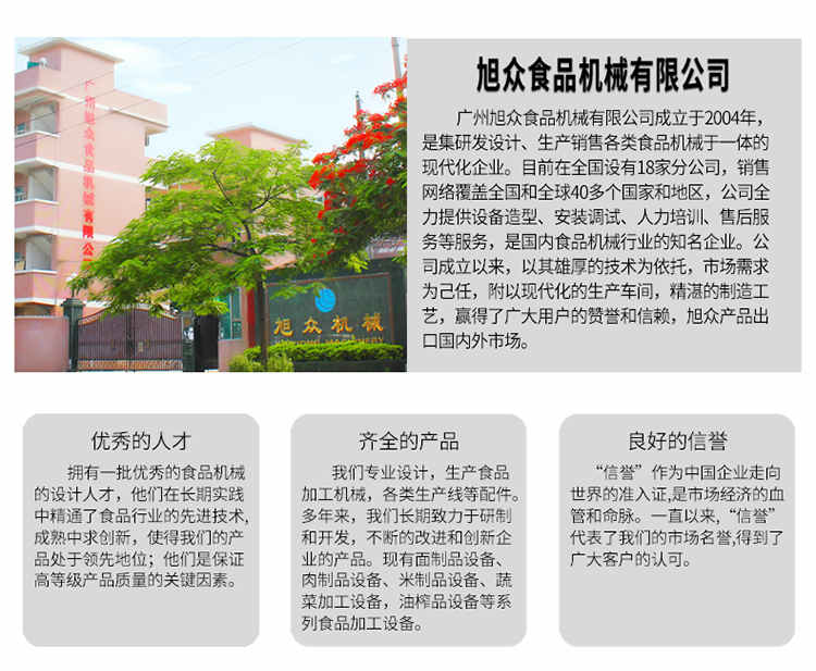 廣州旭眾食品機(jī)械有限公司是一家集科研開發(fā),生產(chǎn)設(shè)計(jì),營銷服務(wù)為一體的現(xiàn)代化生產(chǎn)企業(yè)?,F(xiàn)代化生產(chǎn)車間,精湛制造技術(shù),所產(chǎn)機(jī)械歷經(jīng)市場重重考驗(yàn),不斷贏得海內(nèi)外客戶的贊譽(yù)。