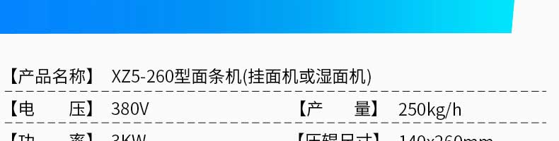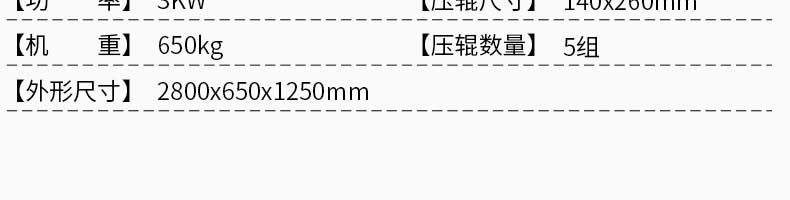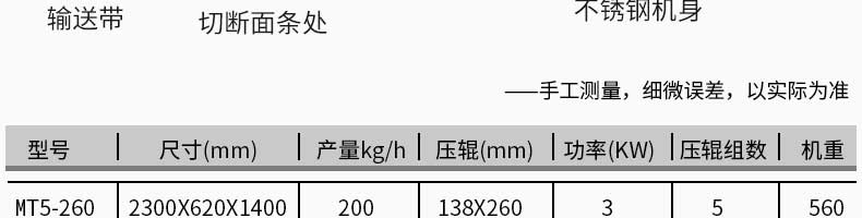 名稱MT5-260型面條機 電源380V 功率3KW 產(chǎn)量250kg/h 尺寸2800X650×1250mm 重量650kg 規(guī)格【壓輥尺寸】140X260mr 其他【壓輥數(shù)量】5組