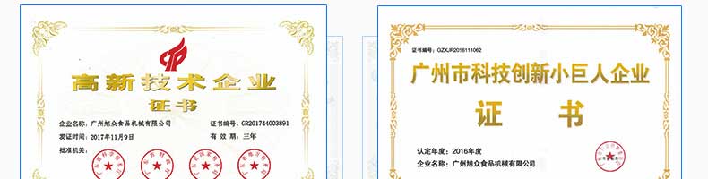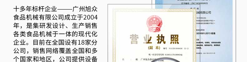廣州旭眾食品機械有限公司是一家集科研開發(fā),生產(chǎn)設計,營銷服務為一體的現(xiàn)代化生產(chǎn)企業(yè)?,F(xiàn)代化生產(chǎn)車間,精湛制造技術,所產(chǎn)機械歷經(jīng)市場重重考驗,不斷贏得海內(nèi)外客戶的贊譽。