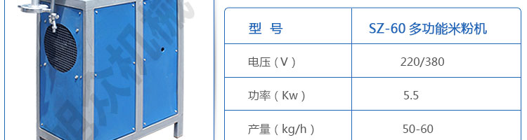 名稱SZ-60多功能米粉機(jī) 電源220/380V 功率5.5kw 產(chǎn)量50-60kg/h 尺寸1230*450*1220mm 重量100kg 規(guī)格 其他