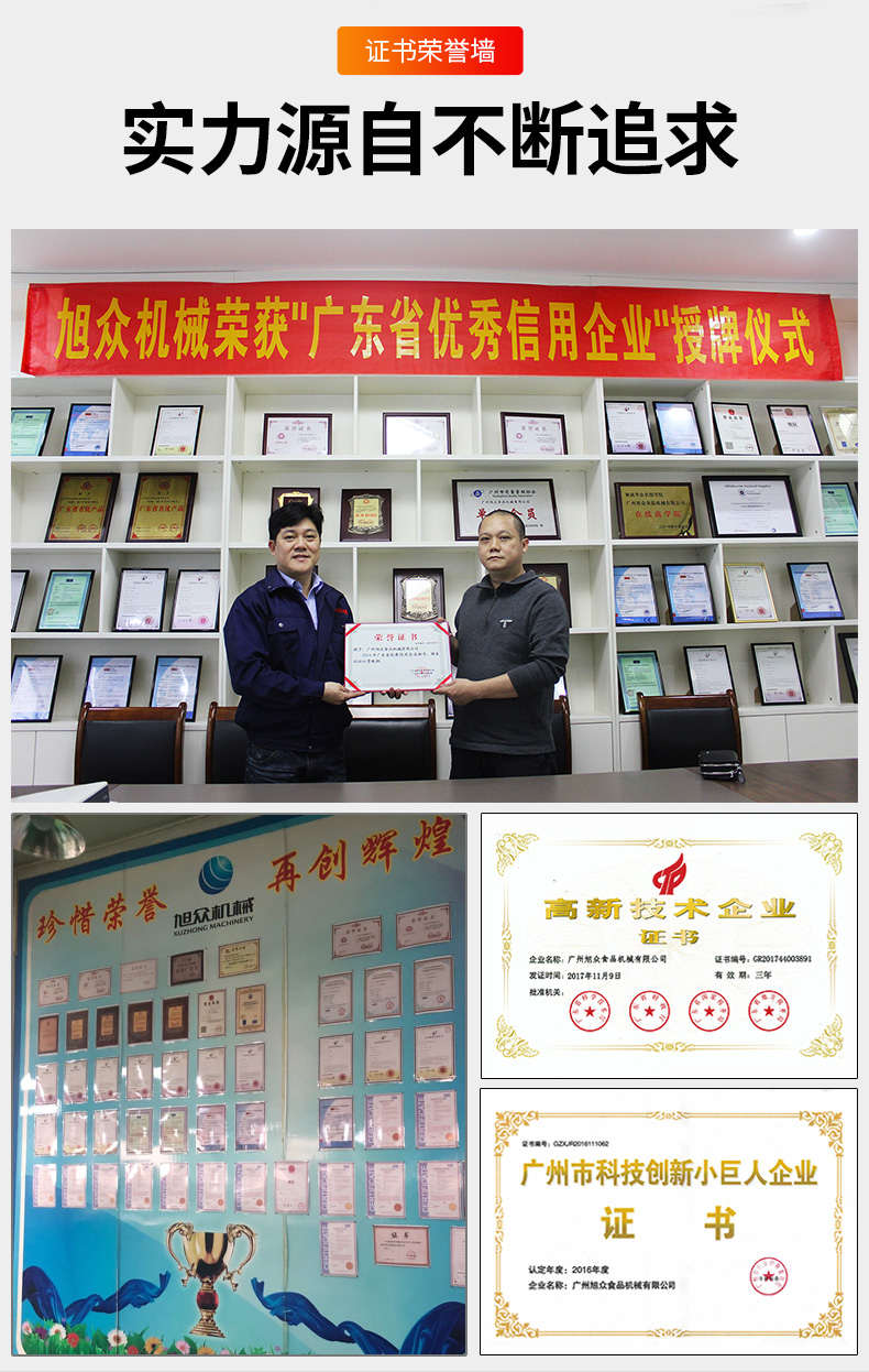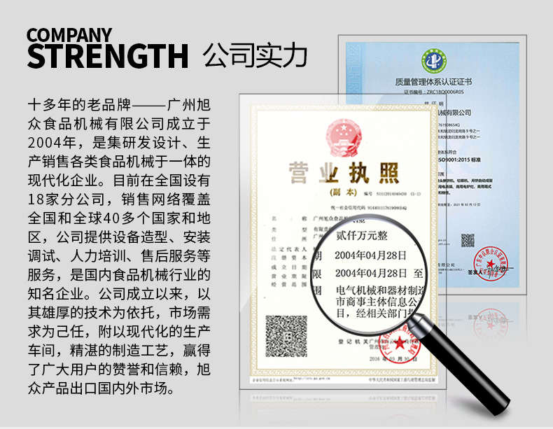 廣州旭眾食品機(jī)械有限公司是一家集科研開發(fā),生產(chǎn)設(shè)計(jì),營(yíng)銷服務(wù)為一體的現(xiàn)代化生產(chǎn)企業(yè)?,F(xiàn)代化生產(chǎn)車間,精湛制造技術(shù),所產(chǎn)機(jī)械歷經(jīng)市場(chǎng)重重考驗(yàn),不斷贏得海內(nèi)外客戶的贊譽(yù)。