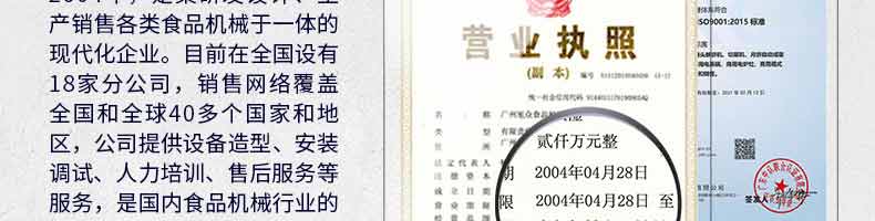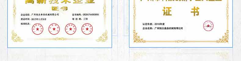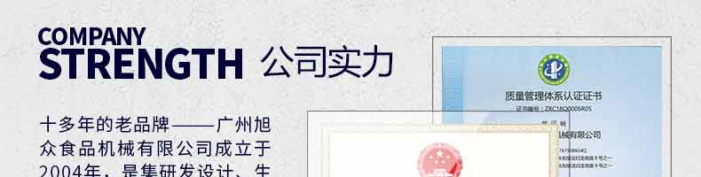 廣州旭眾食品機(jī)械有限公司是一家集科研開發(fā),生產(chǎn)設(shè)計,營銷服務(wù)為一體的現(xiàn)代化生產(chǎn)企業(yè)。現(xiàn)代化生產(chǎn)車間,精湛制造技術(shù),所產(chǎn)機(jī)械歷經(jīng)市場重重考驗,不斷贏得海內(nèi)外客戶的贊譽(yù)。