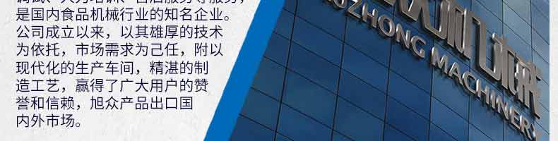 廣州旭眾食品機(jī)械有限公司是一家集科研開發(fā),生產(chǎn)設(shè)計(jì),營(yíng)銷服務(wù)為一體的現(xiàn)代化生產(chǎn)企業(yè)?,F(xiàn)代化生產(chǎn)車間,精湛制造技術(shù),所產(chǎn)機(jī)械歷經(jīng)市場(chǎng)重重考驗(yàn),不斷贏得海內(nèi)外客戶的贊譽(yù)。