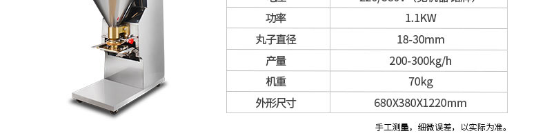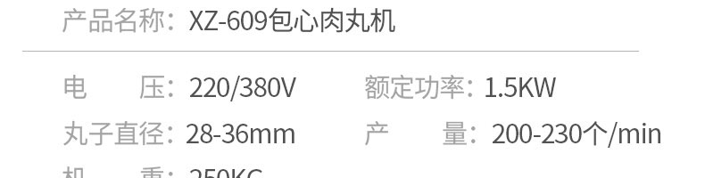 名稱XZ-609包餡肉丸機(jī) 電源220/380v 功率1.5kw 產(chǎn)量200-300個(gè)/min 尺寸730*540*1780mm 重量250kg 規(guī)格丸子直徑:28-36mm 其他