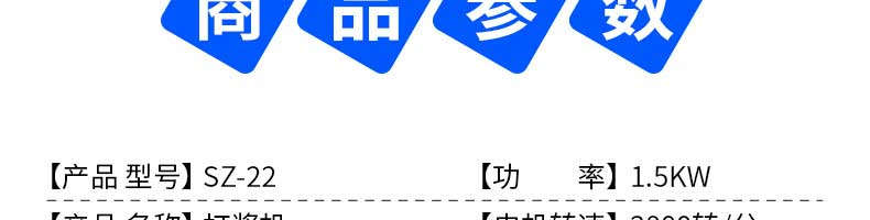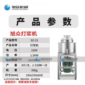 名稱SZ-22快速打漿機(jī) 電源220V 功率1.5KW 產(chǎn)量8斤次,2-3分鐘一次 尺寸330X300X780 重量30kg 規(guī)格聯(lián)系銷售員 其他【電機(jī)轉(zhuǎn)速】2800轉(zhuǎn)/分