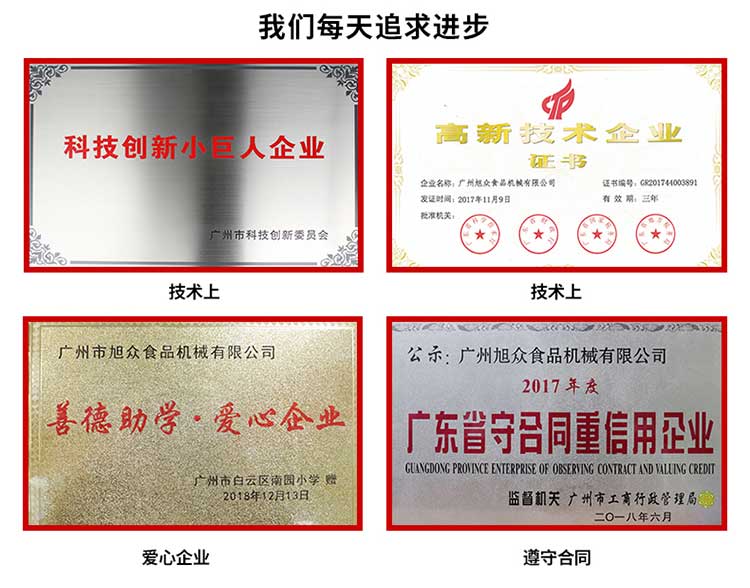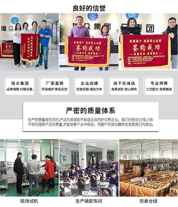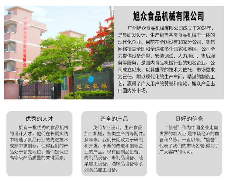 廣州旭眾食品機(jī)械有限公司是一家集科研開發(fā),生產(chǎn)設(shè)計,營銷服務(wù)為一體的現(xiàn)代化生產(chǎn)企業(yè)?,F(xiàn)代化生產(chǎn)車間,精湛制造技術(shù),所產(chǎn)機(jī)械歷經(jīng)市場重重考驗(yàn),不斷贏得海內(nèi)外客戶的贊譽(yù)。