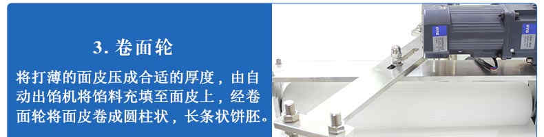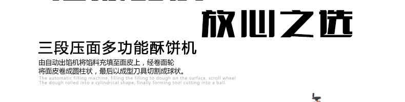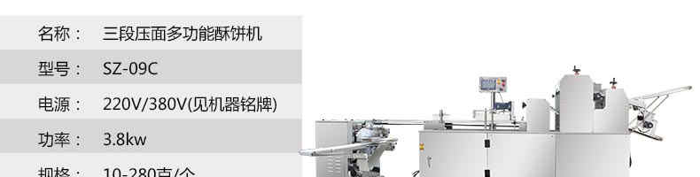 名稱SZ-09C三段壓面蘇式月餅機 電源220/380V(見機器名牌) 功率3.8kw 產(chǎn)量0-3600個/小時 尺寸外形尺寸4100*770*1480mm,捏花機尺寸1500*820*840mm,出餡機尺寸870*4 重量700kg 規(guī)格10-100克/個 其他