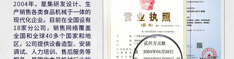 廣州旭眾食品機械有限公司是一家集科研開發(fā),生產(chǎn)設(shè)計,營銷服務(wù)為一體的現(xiàn)代化生產(chǎn)企業(yè)?,F(xiàn)代化生產(chǎn)車間,精湛制造技術(shù),所產(chǎn)機械歷經(jīng)市場重重考驗,不斷贏得海內(nèi)外客戶的贊譽。