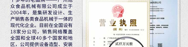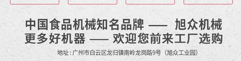 廣州旭眾食品機械有限公司是一家集科研開發(fā),生產(chǎn)設計,營銷服務為一體的現(xiàn)代化生產(chǎn)企業(yè)?,F(xiàn)代化生產(chǎn)車間,精湛制造技術(shù),所產(chǎn)機械歷經(jīng)市場重重考驗,不斷贏得海內(nèi)外客戶的贊譽。