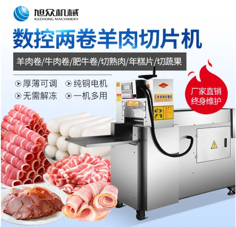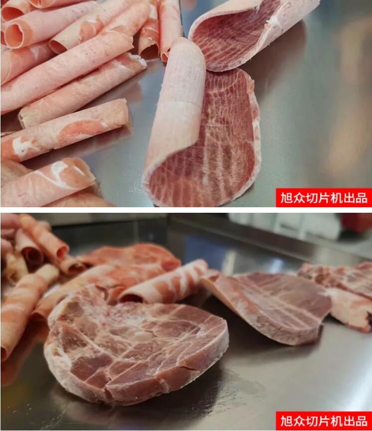 旭眾凍肉切片機,是模擬手工切片的原理,采用變速箱傳動,自動進料、自動切片,一次可切2卷(4卷),羊肉或肥牛。