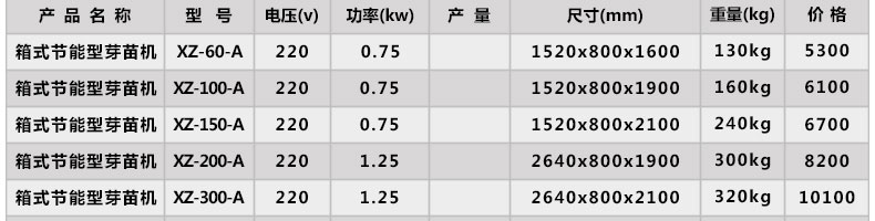 名稱XZ-60-A芽苗機 電源220V 功率0.75kw 產(chǎn)量 尺寸1520*800*1600mm 重量130kg 規(guī)格耗水量0.3day/t;日耗電1度;育苗箱6pcs 其他