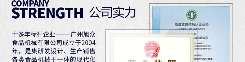 廣州旭眾食品機(jī)械有限公司是一家集科研開發(fā),生產(chǎn)設(shè)計(jì),營(yíng)銷服務(wù)為一體的現(xiàn)代化生產(chǎn)企業(yè)?,F(xiàn)代化生產(chǎn)車間,精湛制造技術(shù),所產(chǎn)機(jī)械歷經(jīng)市場(chǎng)重重考驗(yàn),不斷贏得海內(nèi)外客戶的贊譽(yù)。
