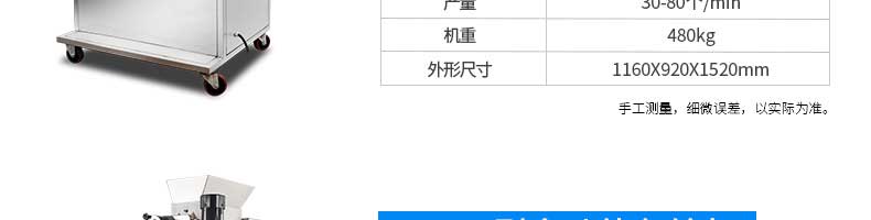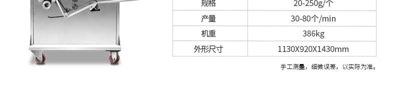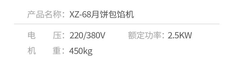 名稱XZ-68月餅包餡機 電源220/380V 功率2.5KW 產(chǎn)量各型號不同,請咨詢銷售員 尺寸1200X930×1355mm 重量450kg 規(guī)格各型號不同,請咨詢銷售員 其他
