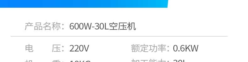 名稱(chēng)空壓機(jī) 電源220v 功率0.6kw 產(chǎn)量30l 尺寸530*290*550mm 重量18kg 規(guī)格 其他