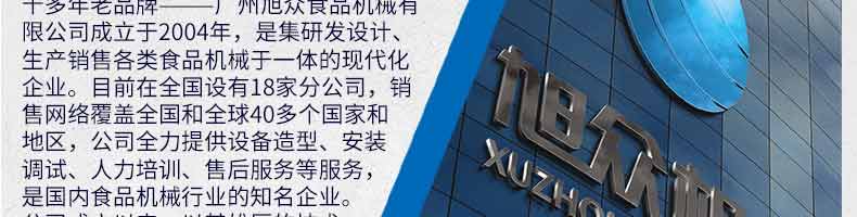 廣州旭眾食品機(jī)械有限公司是一家集科研開(kāi)發(fā),生產(chǎn)設(shè)計(jì),營(yíng)銷(xiāo)服務(wù)為一體的現(xiàn)代化生產(chǎn)企業(yè)?,F(xiàn)代化生產(chǎn)車(chē)間,精湛制造技術(shù),所產(chǎn)機(jī)械歷經(jīng)市場(chǎng)重重考驗(yàn),不斷贏得海內(nèi)外客戶的贊譽(yù)。